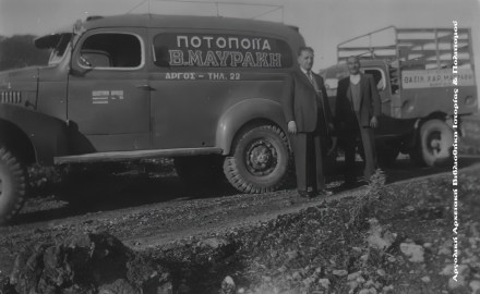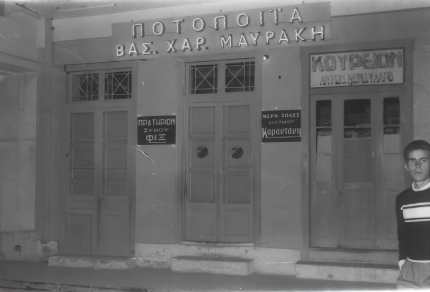 Ο εγγονός του ιδρυτή της ποτοποιίας Μαυράκη, Βασίλης Μαυράκης στο κατάστημα της ποτοποιίας, 1935. Αρχείο Χάρη Μαυράκη. Δημοσιεύεται στο: Οδυσσέας Κουμαδωράκης, «Στα χνάρια του χθες», Εκδόσεις Εκ Προοιμίου, Άργος, 2010.