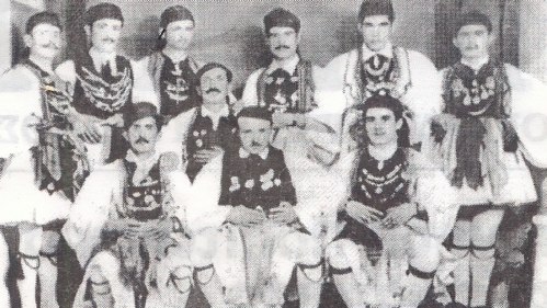 Δεκαετία του 1950: Ομάδα φουστανελοφόρων Αργειτών σε αποκριάτικο γλέντι. (Διακρίνονται: Κ. Μπαλτάς, Α. Λαμπρόπουλος, κ.α).
