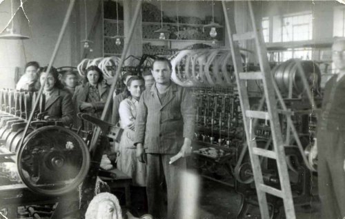 Εργοστάσιο Αφών Παζιώτα. Διακρίνεται ο πρώτος μηχανικός του υφαντουργείου Δημ. Δαγρές, 1949. (αρχ. Μαρίας Μητροβγένη).