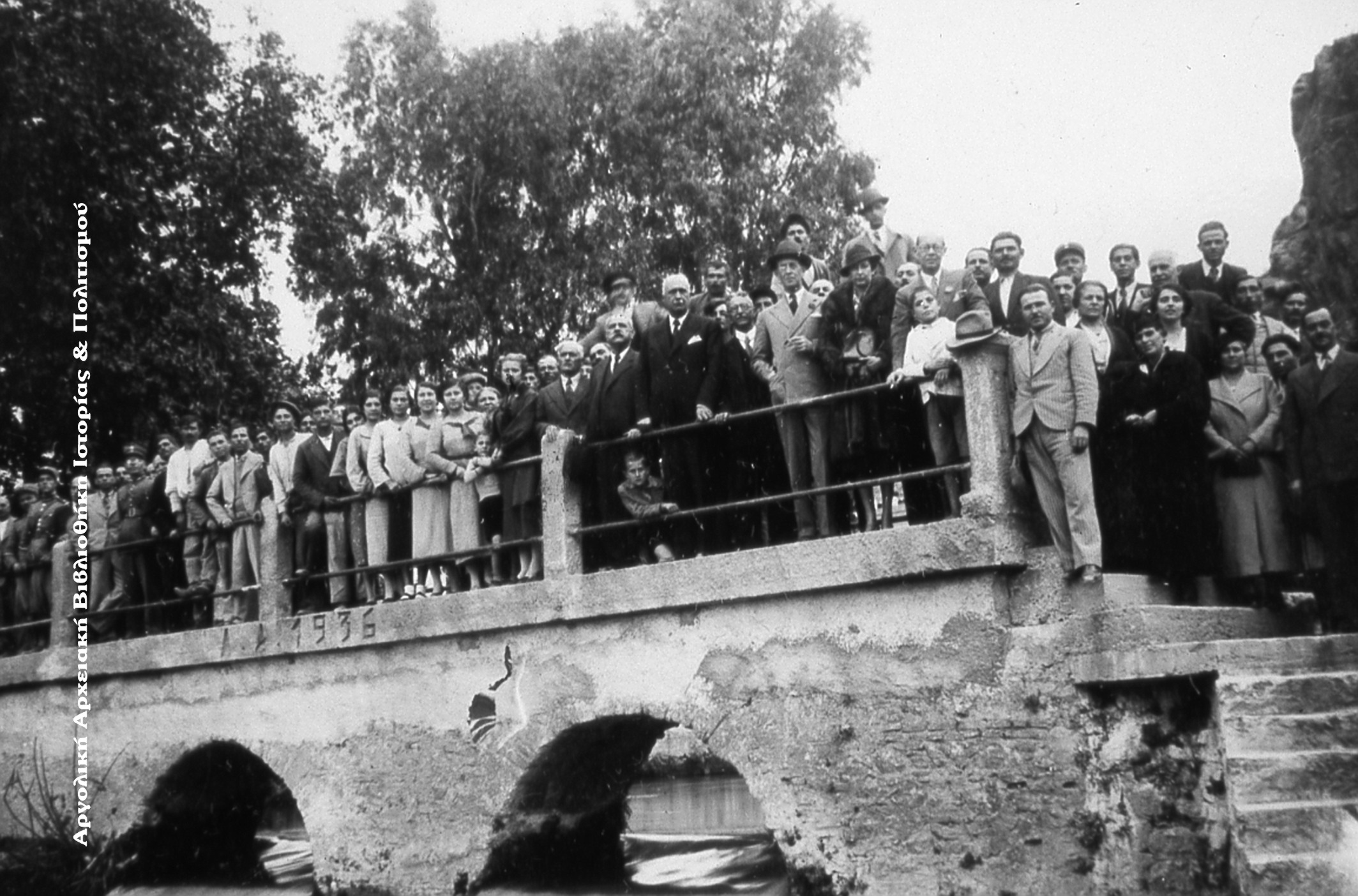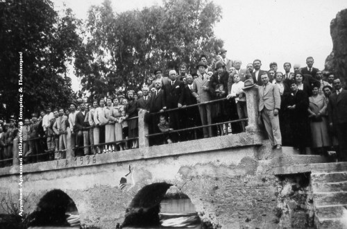 Ο Δήμαρχος Άργους Κωνσταντίνος Μπόμπος (με το μαύρο κουστούμι και το μαντίλι στο πέτο) στο γεφυράκι του Κεφαλαρίου, πιθανόν μετά από κάποια εκδήλωση, περίπου το 1937.