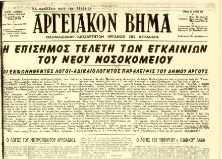 Το «Αργειακόν Βήμα», που αφιέρωσε ολόκληρο το τεύχος της 29ης Ιουλίου 1973 στα εγκαίνια του νέου κτιρίου.