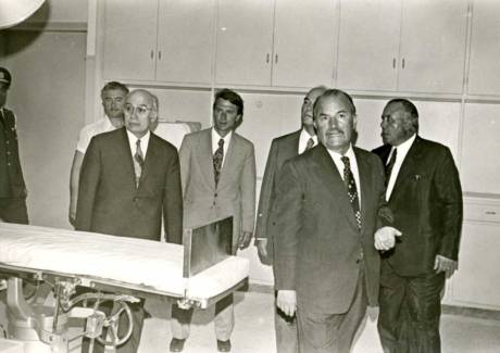 Ο Νομάρχης Εμ. Νικολόπουλος, ο Υπουργός Β. Τσούμπας, ο χειρουργός Δ. Λίτσας, ο Υπουργός Ι. Λαδάς και ο Πρόεδρος του ΔΣ του Νοσοκομείου Δ. Μπόνης.