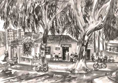 Το καφενείο του Καρμόγιαννη και αριστερά η κρήνη, απέναντι από το Αρχαίο Θέατρο Άργους. Σχέδιο της Ντιάνας Αντωνακάτου στο «Ημερολόγιον του Πολιτιστικού Ομίλου Άργους» το 1981.