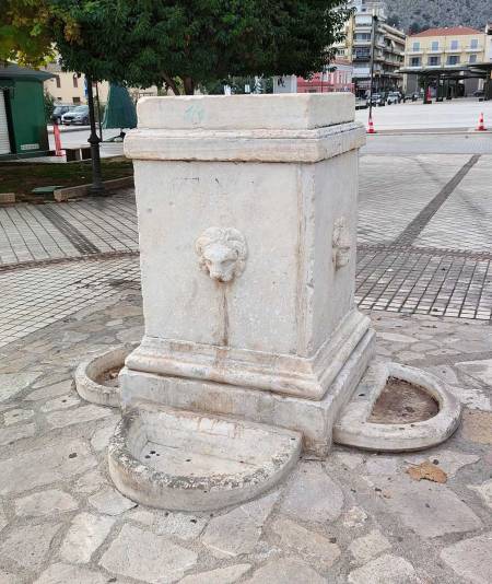 Η Κρήνη στην πλατεία δικαστηρίων στο Άργος (πλατεία Δημητρίου Πλαπούτα). Φωτογραφία του 1989. Σήμερα στερείται του νερού.