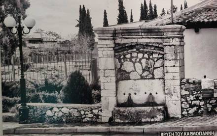 Κρήνη Καρμόγιαννη: Στη διασταύρωση των οδών Θεάτρου, Τριπόλεως και Γούναρη, απέναντι από το αρχαίο θέατρο, βρίσκουμε αυτή την αχρονολόγητη, αλλά πολύ παλαιά βρύση, που οικοδομήθηκε την περίοδο της τουρκοκρατίας και παρουσιάζει αρχιτεκτονικό ενδιαφέρον. Μια επίπεδη ορθογώνια κατασκευή με πελεκητές πέτρες που απολήγει σε περίτεχνο γείσο, που στηρίζεται στις δύο παραστάδες της βρύσης. Ένας σιδερένιος κρουνός στο κέντρο έτρεχε μέχρι πρόσφατα νερό στη μεγάλη πέτρινη τετράγωνη γούρνα μπροστά της. Πίσω από τη βρύση υπάρχει μεγάλη τετράγωνη ανοιχτή δεξαμενή. Ο πέτρινος τοίχος δεξιά κι αριστερά της βρύσης που περικλείει την αυλή του σπιτιού που βρίσκεται πίσω της, μπορούσε να χρησιμεύει και για παγκάκι για τους περαστικούς που ζητούσαν δροσιά και ξεκούραση στη βρύση μιαν άλλη εποχή, όταν η άσφαλτος και τα καυσαέρια δεν υπήρχαν στο δρόμο μπροστά της. Παλαιότερα ήταν γνωστή ως βρύση του Καρμόγιαννη, από το όνομα του ιδιοκτήτη του καφενείου, που στεγαζόταν στο κτίριο που βρίσκεται πίσω της και σήμερα είναι ενταγμένο στον αρχαιολογικό χώρο της αρχαίας αγοράς και ανήκει στην αρχαιολογική υπηρεσία. (ΦΕΚ 761 Β/1980 και 401 Δ/1982).