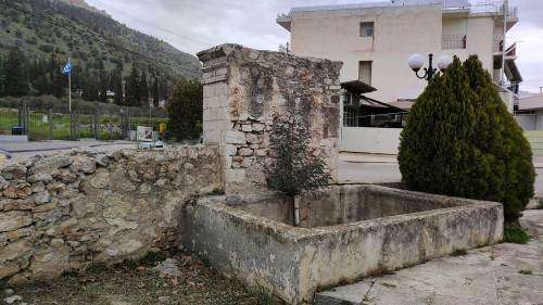 Η μεγάλη τετράγωνη ανοιχτή δεξαμενή πίσω από την Κρήνη Καρμόγιαννη. Λήψη φωτογραφίας 13-3-2023.