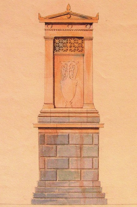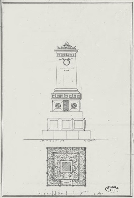 Σχέδιο του αρχιτέκτονα Eduard Schaubert για το ταφικό μνημείο του αρχαιολόγου και συμπατριώτη του Karl Otfried Müller, ο οποίος πέθανε πρόωρα και τάφηκε στην Αθήνα (Γενικά Αρχεία του Κράτους, Οθωνικό Αρχείο, Υπ. Εσωτερικών, φάκ. 206).