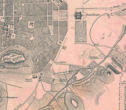 Απόσπασμα από το χάρτη του Γάλλου αρχιτέκτονα Antoine-Marie Chenavard του έτους 1843. Το Προτεσταντικό Κοιμητήριο φαίνεται στα δεξιά της εικόνας απέναντι από την είσοδο του Σταδίου. Αρχεία Δημοτικής Βιβλιοθήκης της Λυόν (Bibliothèque municipale de Lyon).