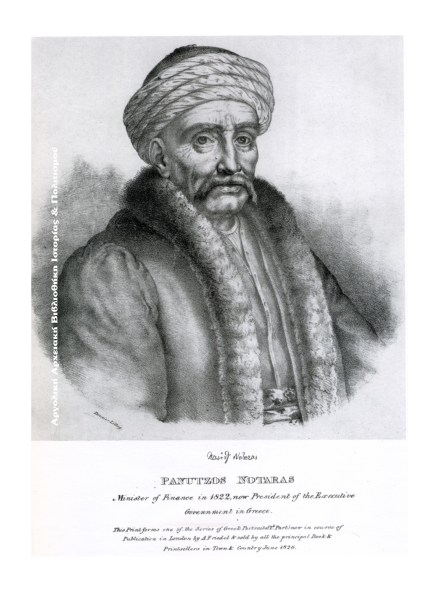 Ο Πανούτσος Νοταράς, Υπουργός των Οικονομικών και Πρόεδρος του Εκτελεστικού Σώματος της Προσωρινής διοικήσεως της Ελλάδος κατά την Ελληνική Επανάσταση. Επιζωγραφισμένη λιθογραφία, Adam Friedel, Λονδίνο – Παρίσι, 1827.