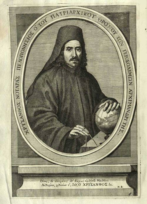 Ο Χρύσανθος Νοταράς (Τρίκαλα Κορινθίας, 1655/1660-1731). Έλληνας λόγιος του 18ου αιώνα και Πατριάρχης Ιεροσολύμων. Είναι γνωστός για το συγγραφικό του έργο καθώς και για τη δημιουργία του πρώτου χάρτη στην ελληνική γλώσσα μετά το Βυζάντιο. Λιθογραφία από το βιβλίο του «Εἰσαγωγὴ εἰς τὰ γεωγραφικά, καὶ σφαιρικά», Παρίσι 1716.