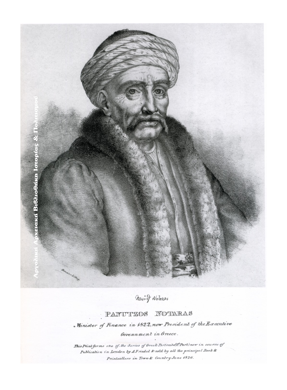 Πανούτσος Νοταράς, Υπουργός των Οικονομικών και Πρόεδρος του Εκτελεστικού Σώματος της Προσωρινής διοικήσεως της Ελλάδος κατά την Ελληνική Επανάσταση. Λιθογραφία, Adam Friedel, 1826.