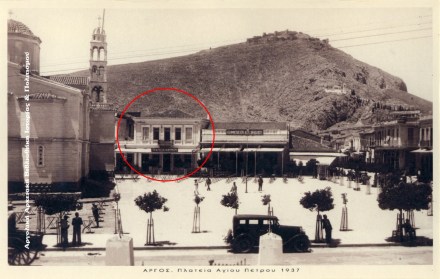 Άργος, Πλατεία Αγίου Πέτρου, 1937. Στον κύκλο το αρχοντικό του μεγαλέμπορου και Δήμαρχου Άργους Χαράλαμπου Μυστακόπουλου. Στο διώροφο αυτό κτίριο με τη σήμανση «Τράπεζα Αθηνών», λειτούργησε αργότερα το καφεζαχαροπλαστείο «Αίγλη» του Κώστα Γραμματικού και Κώστα Αργυράκη. Πολύ αργότερα, περίπου από το 1994, στον πρώτο όροφο και μέχρι πρόσφατα, λειτουργούσε η καφετερία «Αέναον».