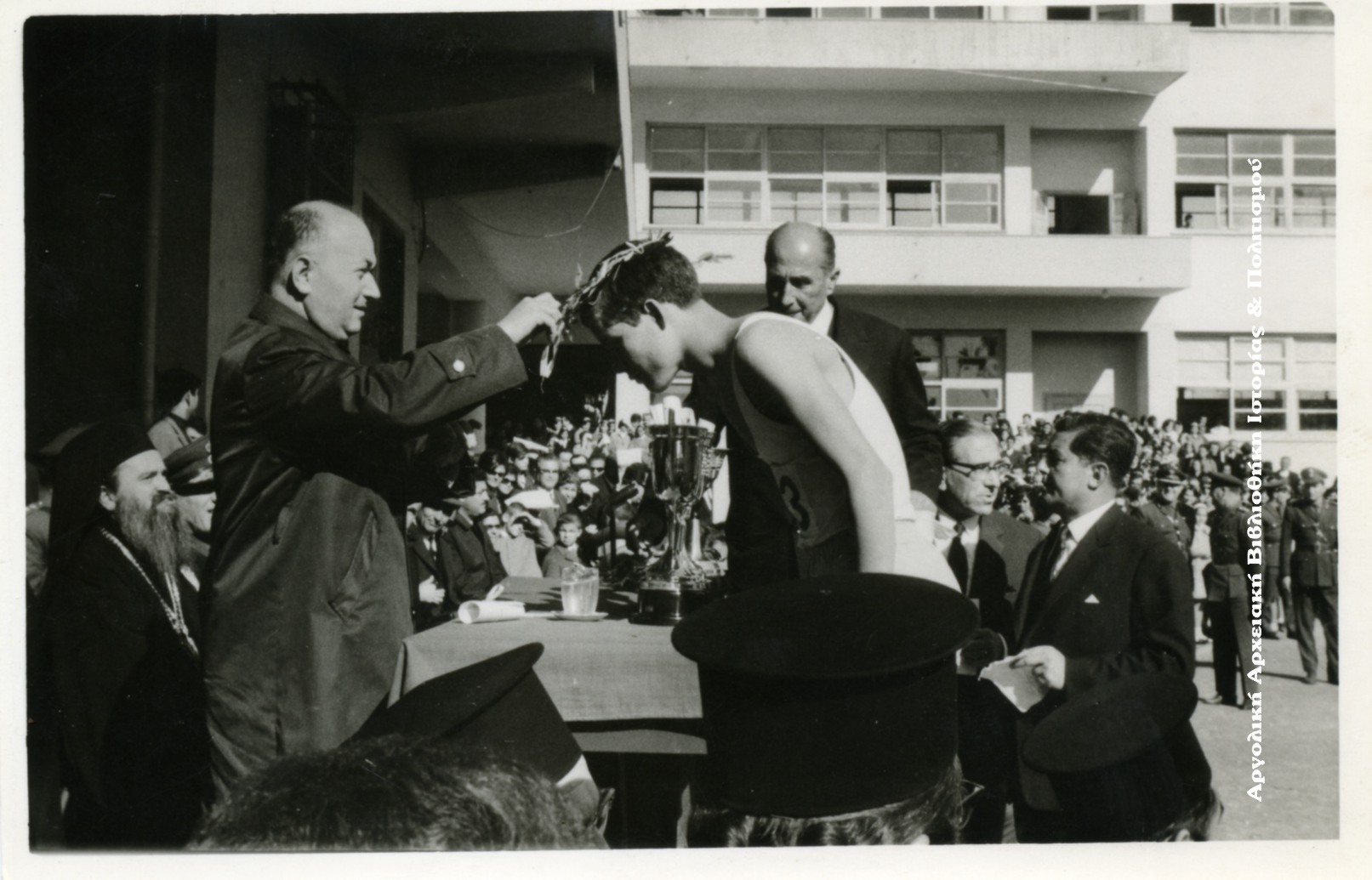 Α’ Μπουσουλοπούλειοι αθλητικοί αγώνες του Γυμνασίου Αρρένων Άργους (28-01-1968), προς τιμή του ευεργέτη Σπυρίδωνα Μπουσουλόπουλου. Ο υπουργός εμπορίου Γεώργιος Γεωργακέλος (1913-2003) στεφανώνει τον νικητή του δρόμου 1.500 μ. ημιαντοχής Στ. Σούρσο της Γ2 τάξης. Διακρίνονται: Απ. Χατζηεμανουήλ, Γυμνασιάρχης Αρρένων, Κωνσταντίνος Σταθόπουλος, Επιθεωρητής Σωματικής Γυμναστικής Αγωγής, Ματθαίος Μούκας, Καθηγητής Σωματικής Αγωγής Γυμνασίου Αρρένων Άργους. Αρχείο: Ματθαίου Μούκα.