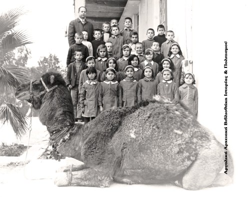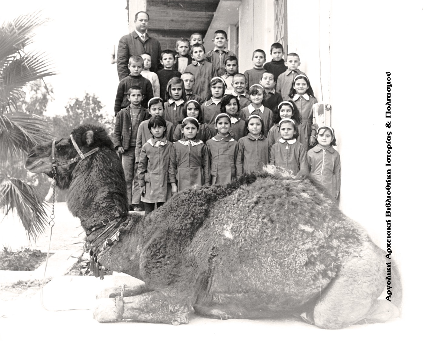 Δημοτικό Σχολείο Αγίου Αδριανού Αργολίδας, 1968. Τότε που η καμήλα στα σχολεία και η φωτογραφία ήταν σπουδαίο γεγονός. Μια συλλεκτική φωτογραφία που μας θυμίζει πως κάποτε στην Ελλάδα υπήρχαν καμήλες. Δάσκαλος Κωνσταντίνος Μπουντούρης. Διακρίνονται: Δημήτρης Γεργόπουλος, Γεώργιος Γεωργόπουλος, Βασίλης Φιλίνης, Αλέκα Καζά, Δημήτρης Τρίγκας, Δήμητρα Κορδοπάτη, Θανάσης Μητρόπουλος, Μαρκία Κορδοπάτη, Ξανθή Σωτηροπούλου, Μαρία Βλαχοπούλου, Μαρία Κορδοπάτη. Δημοσιεύεται στο βιβλίο του Βασίλη Παπαμιχαλόπουλου, «Ένα χωριό γράφει την ιστορία του, Κατσίγκρι – Άγιος Αδριανός», 2002.