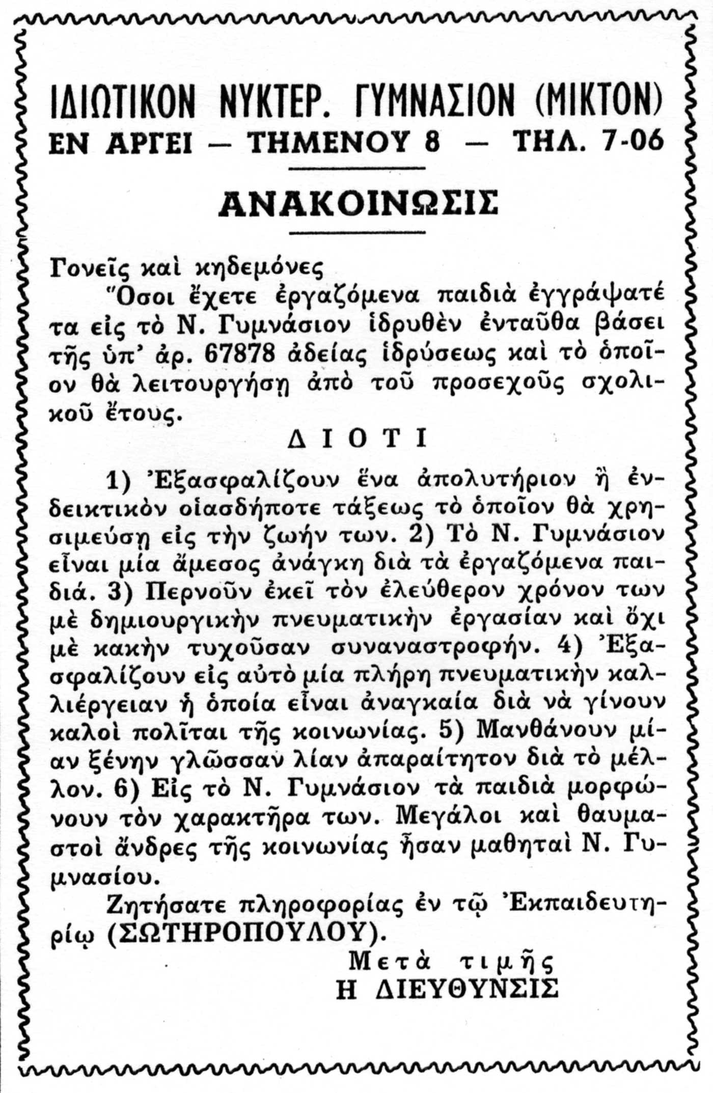Η εκπαίδευση στην Αργολίδα – Ματιές σε μαρτυρίες χρόνων και σε εικόνες τόπων » Ιδιωτικό Νυχτερινό Γυμνάσιο