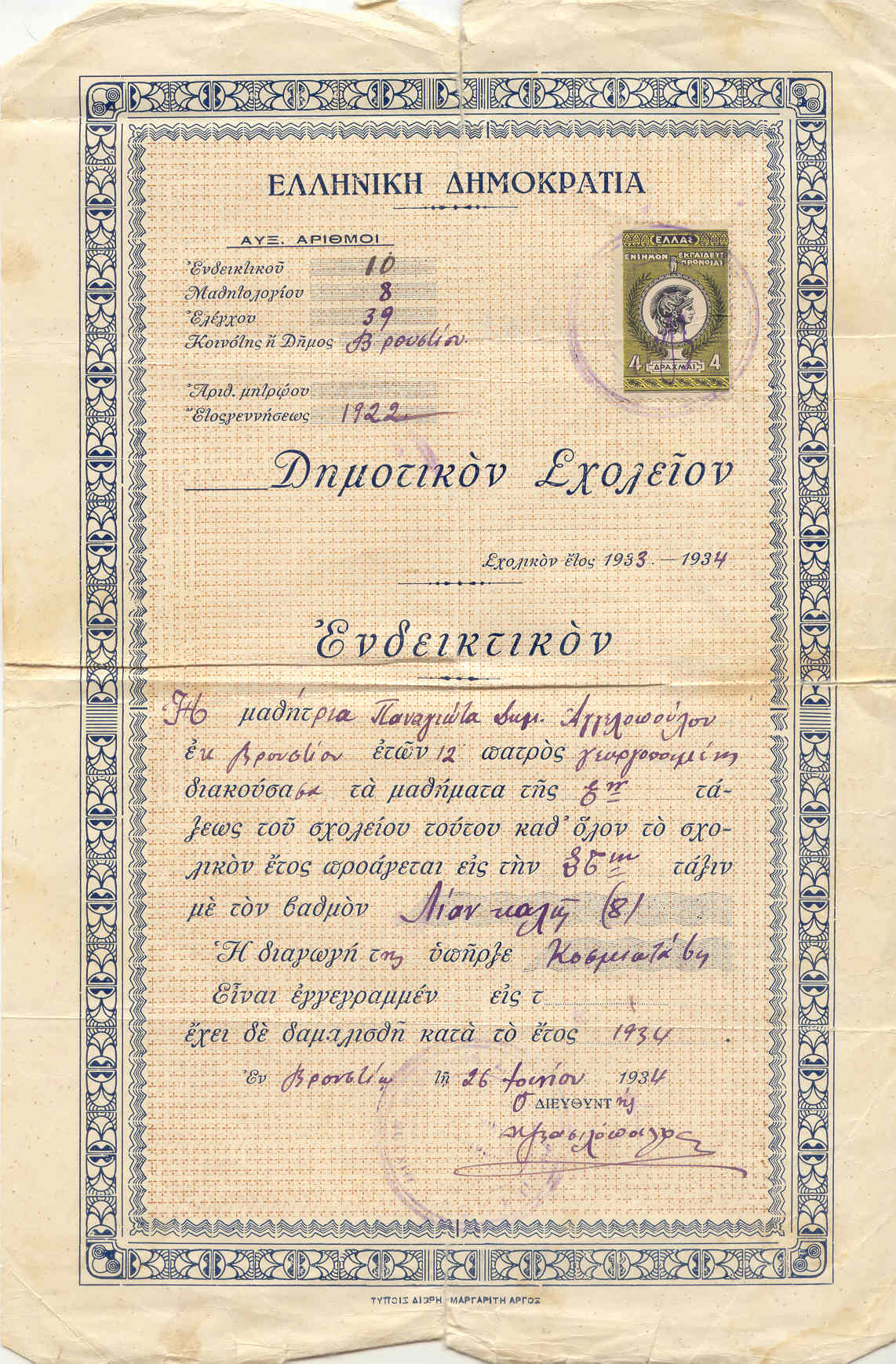 Η εκπαίδευση στην Αργολίδα – Ματιές σε μαρτυρίες χρόνων και σε εικόνες τόπων » Ενδεικτικό Δημοτικού Σχολείου Βρουστίου Αργολίδας, 1934.
