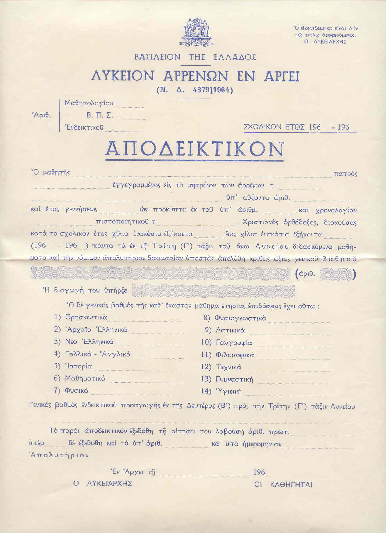 Λύκειο Αρρένων Άργους, Αποδεικτικό.