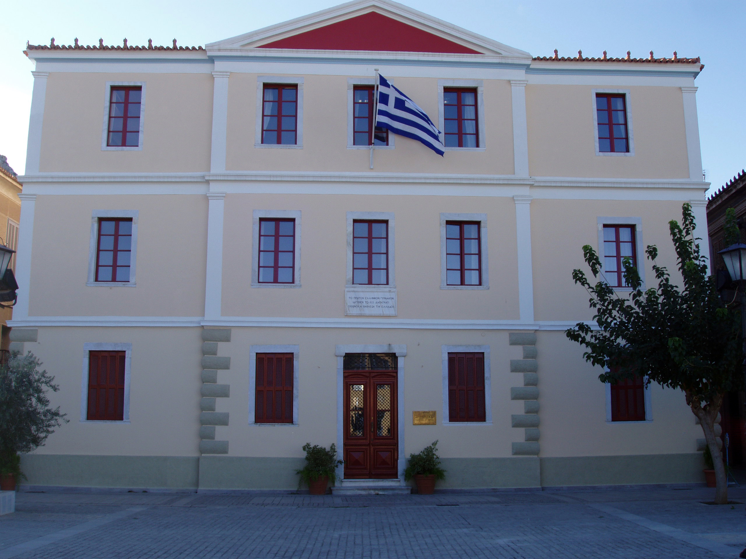 Ναύπλιο, το παλαιό Γυμνάσιο Ναυπλίου. Σήμερα στεγάζει το Δημαρχείο του Ναυπλίου. Kτίστηκε το 1857 για να στεγάσει το Γυμνάσιο του Nαυπλίου, που είχε ιδρυθεί το 1833, επί βασιλείας Όθωνα. Tο κτίριο του Γυμνασίου αρχικά ήταν μονόροφο, ενώ το 1893 προστέθηκε και δεύτερος όροφος, προκειμένου να στεγαστεί εκεί και το Eλληνικό Σχολείο. Tότε το Γυμνάσιο μετακόμισε στον πρώτο και στον δεύτερο όροφο, ενώ το Eλληνικό Σχολείο στεγάστηκε στο ισόγειο.