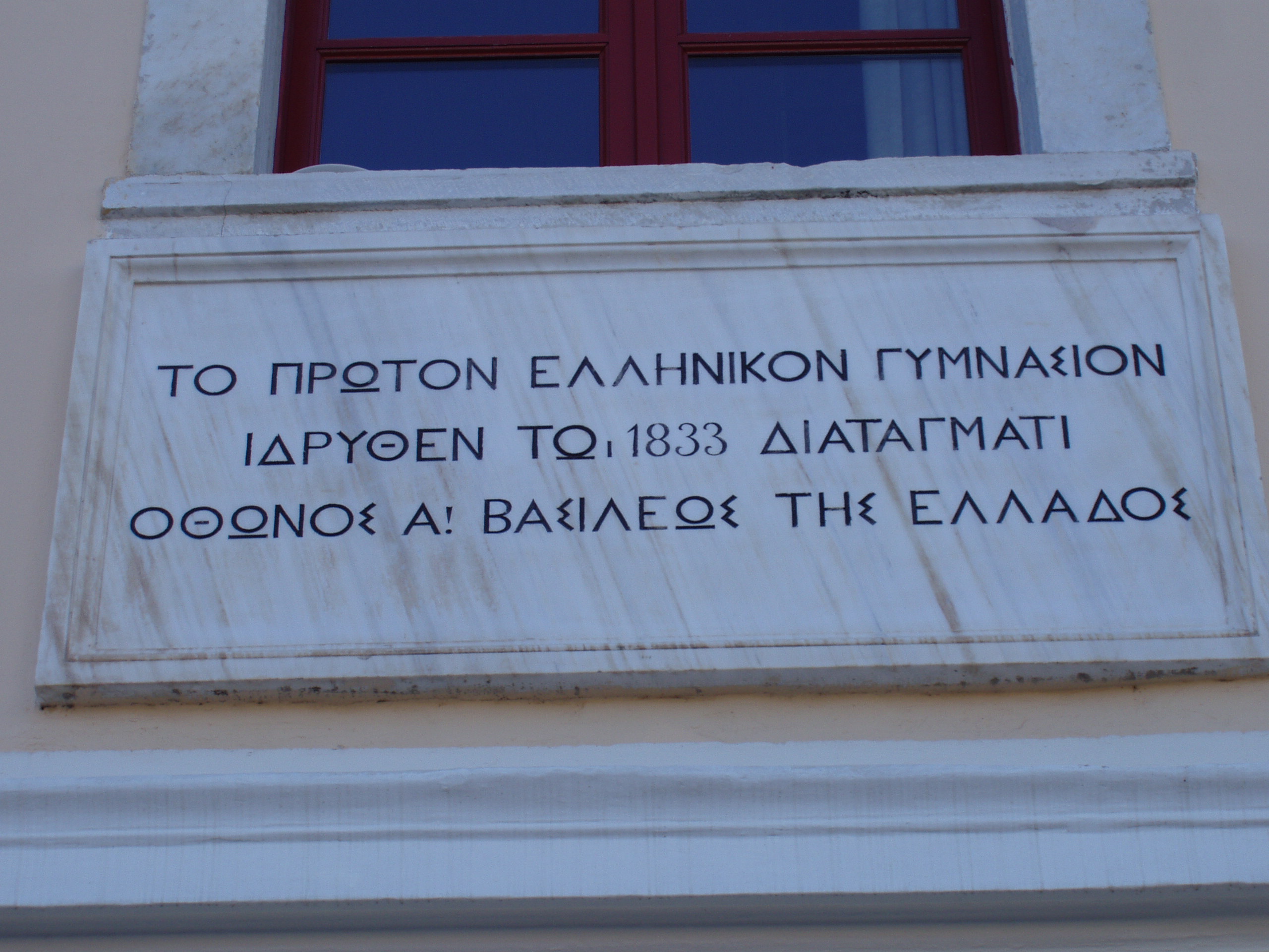 «το πρώτον ελληνικόν γυμνάσιον ιδρυθέν τω 1833 διατάγματι Όθωνος Α΄ Βασιλέως της Ελλάδος»