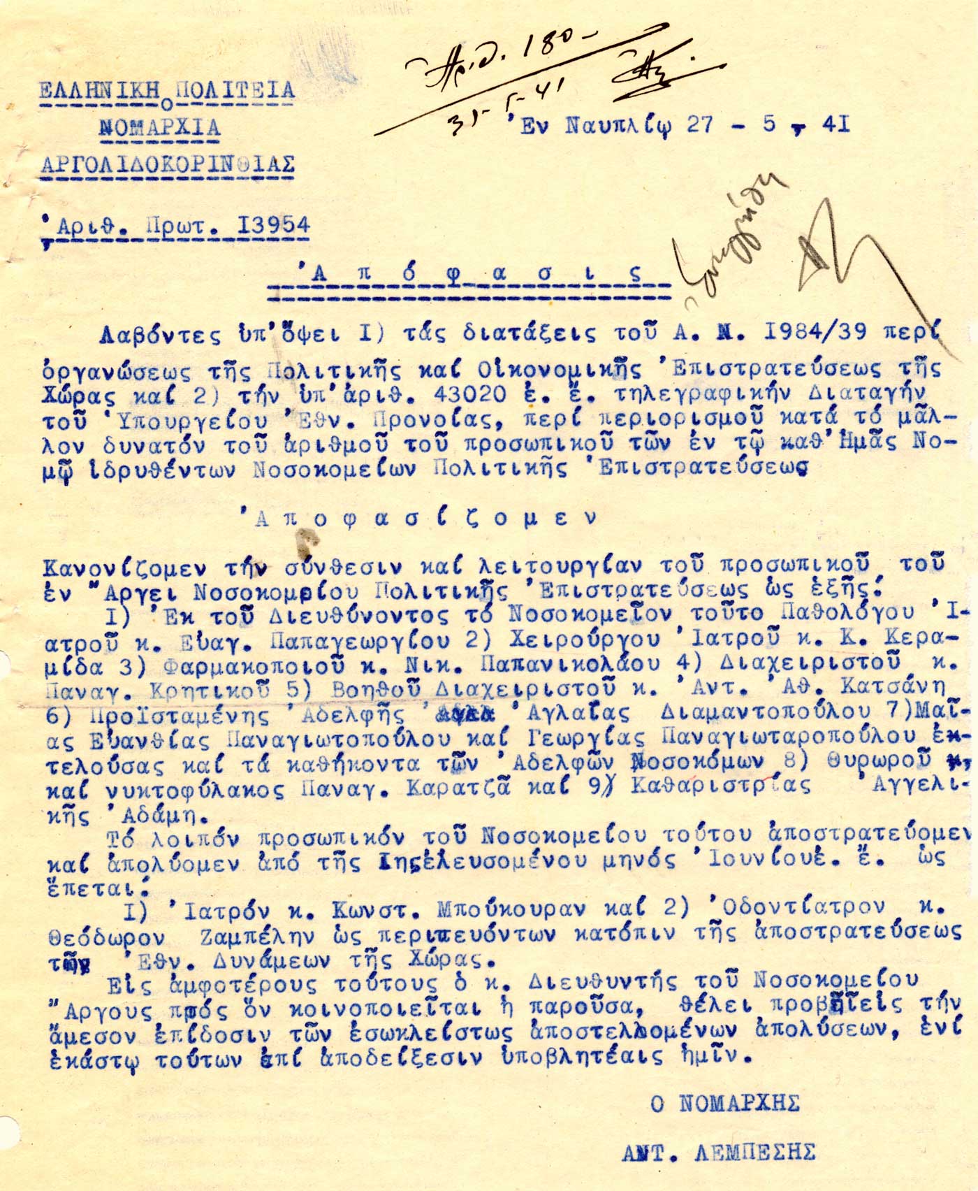 Έγγραφο των πρώτων ημερών της Γερμανικής Κατοχής, το οποίο, «κατόπιν διαταγής περί περιορισμού κατά το μάλλον δυνατόν του αριθμού του προσωπικού», ορίζει «…την σύνθεσιν και λειτουργίαν του εν Άργει Νοσοκομείου Πολιτικής Επιστρατεύσεως..».