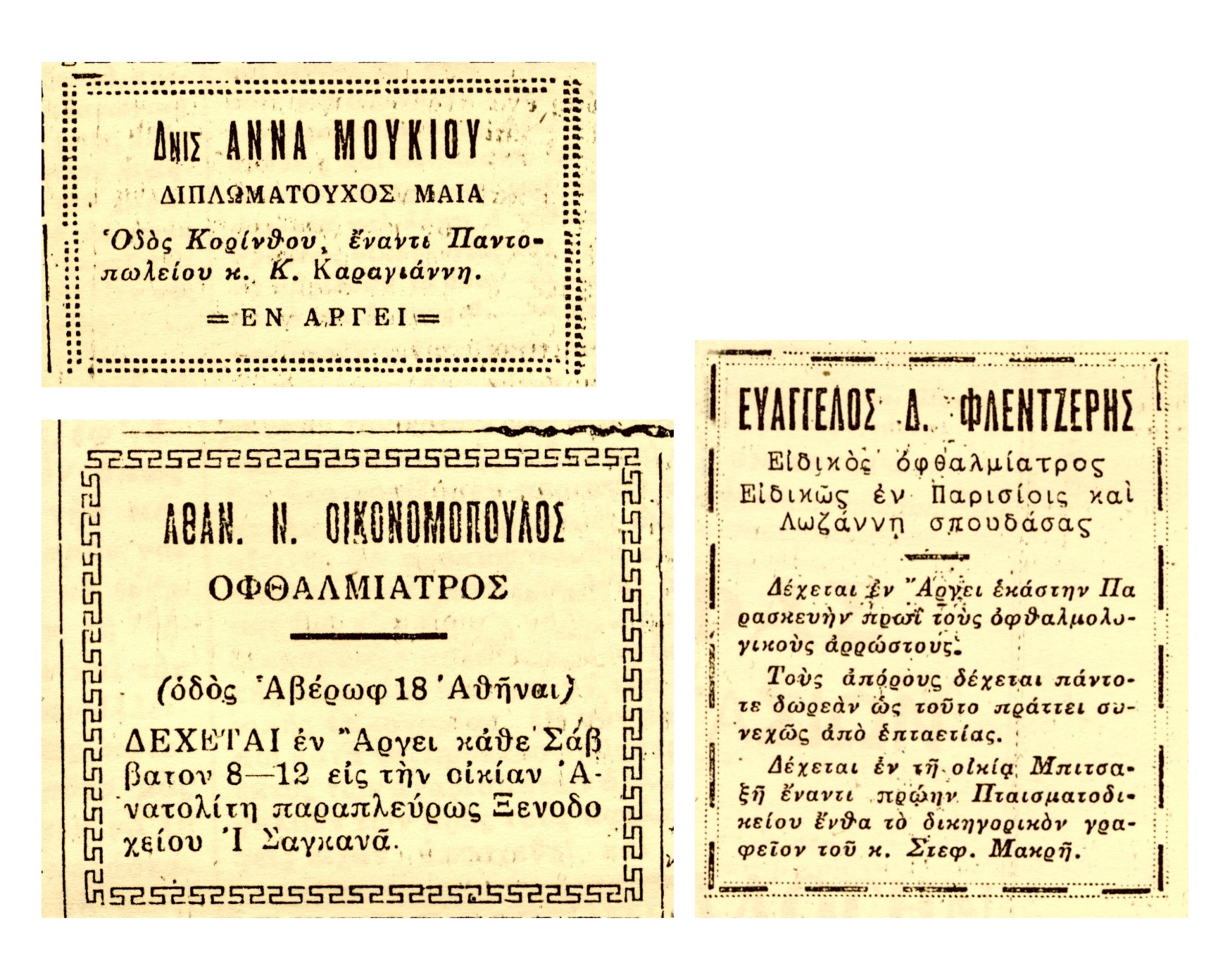 Καταχωρήσεις στον τύπο των ετών 1933-1937 «επισκεπτών» ιατρών που έχουν την έδρα τους στην Αθήνα και δέχονται τους Αργείους ασθενείς.