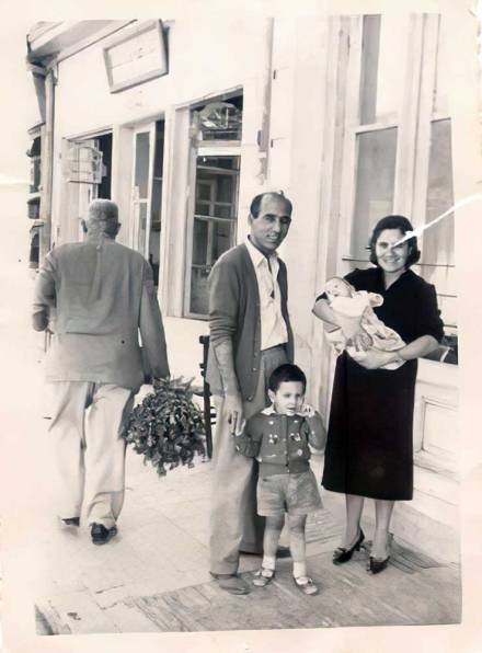 Ο Δημήτρης Παπαγεωργίου με τη σύζυγό του Ελισάβετ το γένος Ευαγγελάτου και τα παιδιά τους, Παναγιώτη και Άκη, στην αγκαλιά της μητέρας του, έξω από το φαρμακείο τους, το 1958. Δίπλα το κουρείο του Μαρίνου.