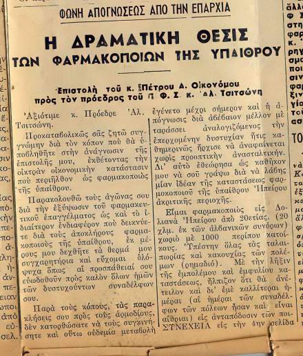 Από τη δεκαπενθήμερη επιστημονική εφημερίδα των απανταχού φαρμακοποιών «Αγών των φαρμακοποιών» (30 Απριλίου 1960), η επιστολή με τίτλο «Η δραματική θέσις των φαρμακοποιών της υπαίθρου».
