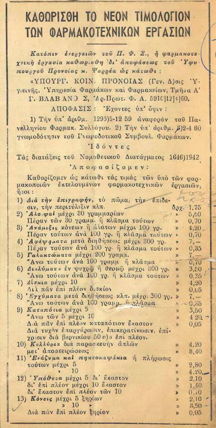 «Γνωρίζομεν υμίν», αναφέρει το έγγραφο του ΙΚΑ που απευθύνεται στους παραπάνω φαρμακοποιούς, «ότι οι Φαρμακοποιοί της πόλεώς σας οι εκτελούντες συνταγάς ΙΚΑ εκ παρανοήσεως προφανώς της τελευταίας αναπροσαρμογής των ποσών της φαρμακευτικής εργασίας τιμολογούν επί των συνταγών, δια περιτύλυξιν ορών, ξηρίων κ.λ.π. δραχμάς 1.75 ενώ το ανωτέρω ποσό αφορά τον φελλόν εττικέταν και περιτύλυξιν υγρών σκευασμάτων και μόνον. Η περιτύλυξις δισκίων, φυσσίγγων γενικώς, ξηρίων, καψακίων κ.λ.π. εξακολουθεί να παραμένει εις τα υπό του Συνταγολογίου του ΙΚΑ καθοριζόμενα ποσά μιας, μιας και ημισίας και δυο δραχμών αναπροσαρμοζομένων, με τον συντελεστήν 0,350 ήτοι δραχμάς σημερινάς 0,35-0,50 και 0,70».