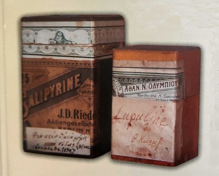 Αν η απουσία γραπτών κειμένων δεν διευκολύνει την παρουσίαση της λειτουργίας του φαρμακείου στην εποχή του, υπάρχουν τα ίδια τα υλικά που, ως ιστορικά τεκμήρια, φανερώνουν μέρη της ιστορίας του φαρμάκου και του φαρμακείου: εταιρείες (Bayer, Ried, κ.ά), σκευάσματα (λουπουλίνη, ανθρακική σόδα, κ.ά), φάρμακα (κινίνο, διαλυτή ασπιρίνη, κ.ά.). Τα κουτάκια φύλαξης φαρμάκων και φαρμακευτικών σκευασμάτων έχουν τη δική τους ιστορία που τη διηγούνται με την ετικέτα τους, τις ημερομηνίες τους, τις ονομασίες προέλευσης.