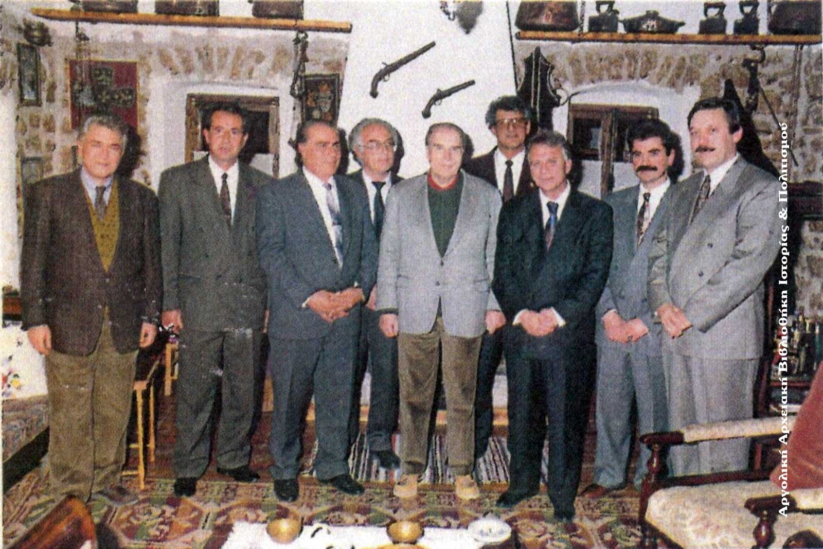 Ο Φρανσουά Μιτεράν με προσωπικότητες της Τοπικής Αυτοδιοίκησης στο σπίτι στους Μύλους. Διακρίνονται (από δεξιά): Σ. Κωτσοβός, Π. Παναγάκης, Δ. Παπανικολάου, (Δημαρχος Αργους), Π. Κωτσονάρος, Φρ. Μιτεράν, Ν. Γκικόπουλος, Μ. Κορομίχης, (Προεδρος κοινοτητας Μυλων). Β. Κοδέλας, Χρ. Μαχαιρίτσας.