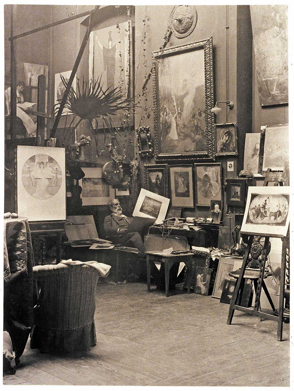Ο σημαντικός Έλληνας ζωγράφος του 19ου αιώνα της λεγόμενης «Σχολής του Μονάχου», Νικόλαος Γύζης (Σκλαβοχώρι Τήνου, 1 Μαρτίου 1842 – Μόναχο, 22 Δεκεμβρίου 1900), στο εργαστήριό του. Φωτογραφία του Ελίας φαν Μπόμελ.
