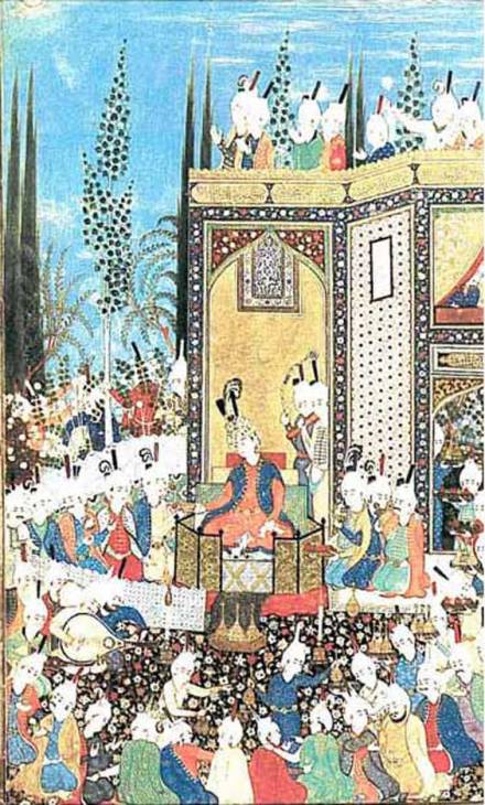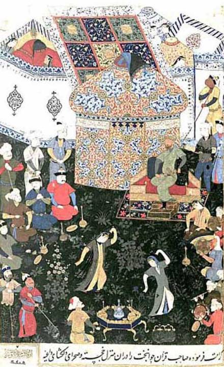Εορτασμός νίκης στο στρατόπεδο του Τιμούρ. Ο ίδιος κάθεται σε πρόχειρα φτιαγμένο θρόνο και παρίστανται ευγενείς, σωματοφύλακες, χορεύτριες και μουσικοί. Μικρογραφία από το χφ. Zafernâme του Serefeddin Ali Yezdî 1436. Siraz, Iran, Turk ve Islam Eserlerì Müzesi, Istanbul.