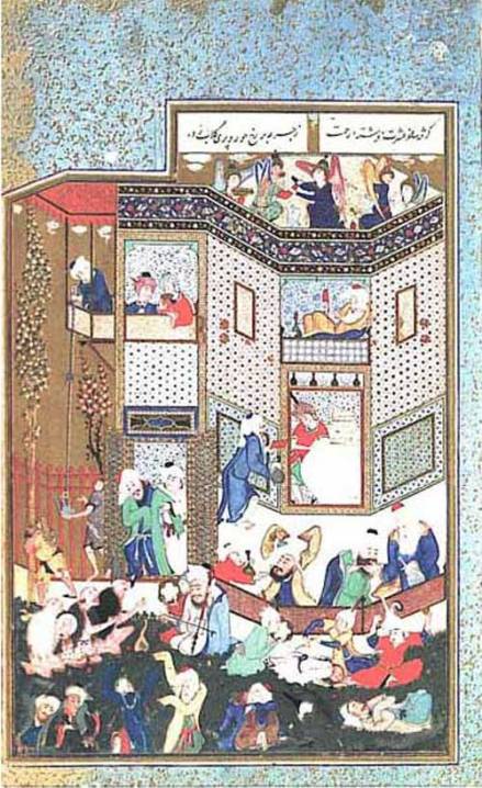 «Η γιορτή του Ιντ αρχίζει» από το Ντιβάν του ποιητή Χαφίζ. Στο δεξί μέρος της ενεπίγραφης ζώνης που διατρέχει την κορυφή του κτιρίου είναι γραμμένοι οι στίχοι: «Ρόδα και φίλοι ανυπόμονα προσμένουν, γιατί είναι η ώρα του Ιντ. Οινοχόε! Κοίτα στου βασιλιά τη λαμπερή την όψη του φεγγαριού την λάμψη και φέρε το κρασί!». Περσικό χφ. περίπου 1527, φ. 86α, Fogg Museum of An, Harvard University.