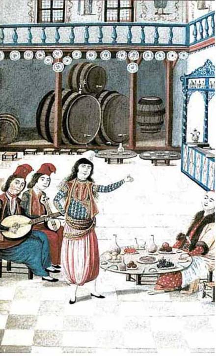 «Πλούσιος Κληρονόμος γλεντά σε καπηλειό». Από το χφ. Hûbannânne του Fâzil bin Tahir Enderûnî (1759-1810), Istanbul Universités/ Kütüphanesi, Istanbul.