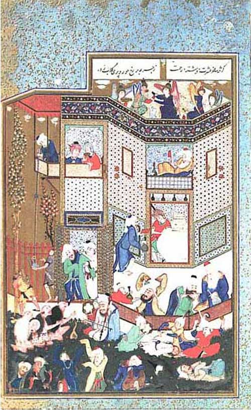 «Επίγεια και υπερκόσμια μέθη» από το Ντιβάν του Πέρση ποιητή Χαφίζ. Στην κορυφή της μικρογραφίας γραμμένα τα λόγια του ποιητή: «Ο άγγελος του ελέους λαμβάνει την κούπα της αποκάλυψης». Πάνω από τα μεγάλα πιθάρια του κρασιού, στο παράθυρο ο ίδιος ο Χαφίζ σε θρησκευτική έμπνευση. Περσικό χφ. περίπου 1527, φ. 135α, Fogg Museum of Art, Harvard University.