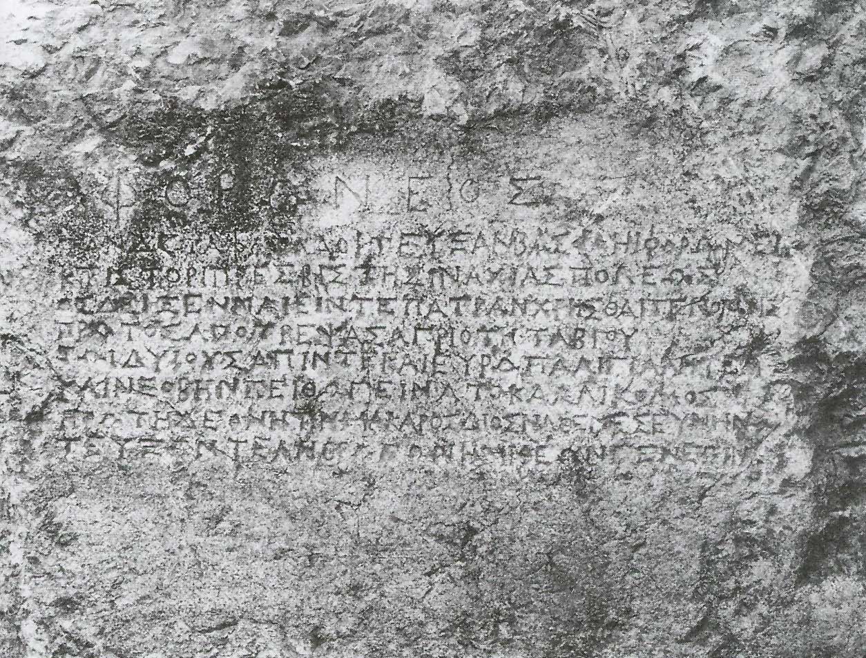 Ο ενεπίγραφος λίθος που ήρθε στο φως τον Ιούλιο του 1994. Πρόκειται για ένα ορθογώνιο λίθο από λευ¬κό ασβεστόλιθο, μεγάλων διαστάσεων και σχήμα τραπεζοειδές. Στην πρόσθια κύρια του όψη φέρει χαραγμένο το παρακάτω επιτύμβιο επίγραμμα με τίτλο «Φορωνέος».