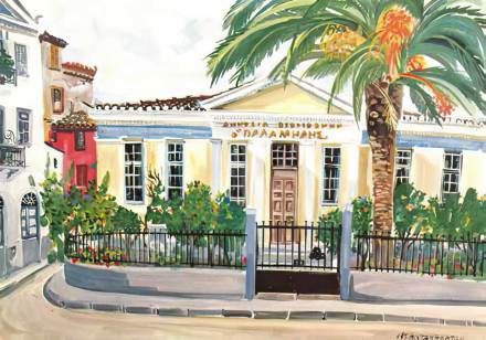Δυτική άποψη του νεοκλασικού σχολείου (Βιβλιοθήκη) με τη δυτική αετωματική είσοδο (παλιά φωτογραφία).