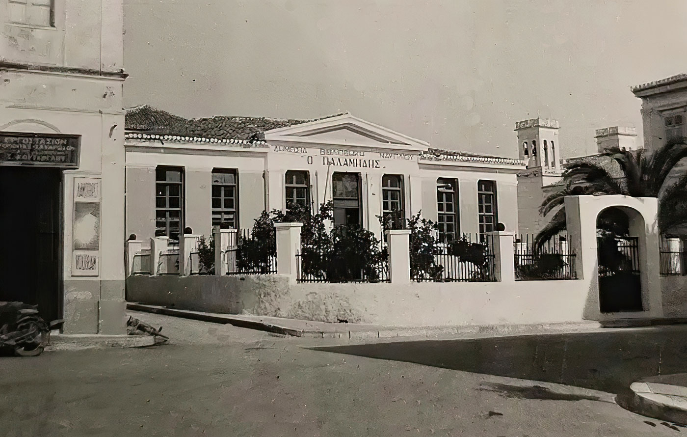Δημόσια Κεντρική Βιβλιοθήκη Ναυπλίου «Ο Παλαμήδης». Η φωτογραφία απεικονίζει τη βιβλιοθήκη πριν το 1957 όταν δεν είχε κτισθεί ακόμη η πίσω αίθουσα (Αναγνωστήριο). Διατηρείται η τεχνοτροπία του παλιού Δημοτικού Σχολείου (Β’ Ναυπλίου) που στεγαζόταν εκεί προπολεμικά, το οποίο είχε δύο προαύλια (εμπρός και πίσω).