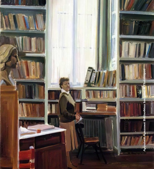 Η Διευθύντρια Ασπασία Σκαρβέλη στο αναγνωστήριο της Βιβλιοθήκης (πίνακας Ντ. Αντωνακάκου).