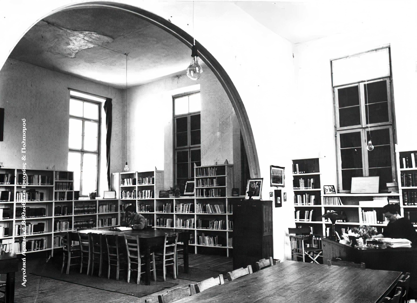 Μερική άποψη της αίθουσας του παλιού αναγνωστηρίου με τα τραπέζια και τα βιβλιοστάσια (φωτ. Ν. Τομπάζη 1957, αναδημοσιευμένη στο ημερολόγιο Πρωτοβουλίας Δημοτών Ναυπλίου 1993).