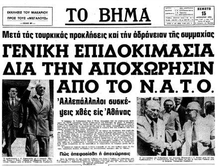 Η στάση των κρατών-μελών του ΝΑΤΟ μετά την εισβολή των τουρκικών στρατευμάτων στην Κύπρο στις 20 Ιουλίου 1974, που ολοκληρώθηκε με τον «Αττίλα ΙΙ», οδήγησε την Αθήνα στην απόφαση να αποσύρει τις ελληνικές ένοπλες δυνάμεις από το στρατιωτικό σκέλος της Συμμαχίας. «Το ΒΗΜΑ», 15 Αυγούστου 1974.