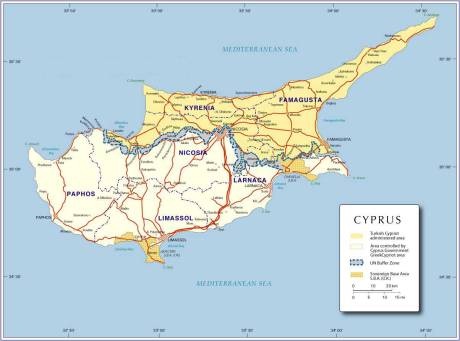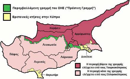 Χάρτης των περιφερειών της Κύπρου, όπου φαίνεται η «Πράσινη Γραμμή» η οποία καθορίζει την κατανομή του πληθυσμού της από το 1974 κι έπειτα.
