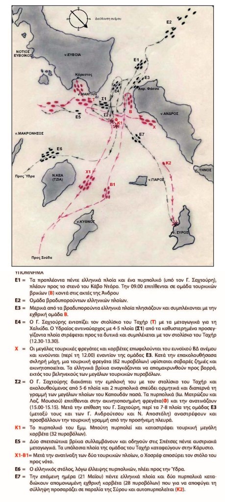 Σχεδιάγραμμα: Η Ναυμαχία του Κάβο Ντόρο στο στενό του Καφηρέα της Νότιας Εύβοιας, 20 Μαΐου 1825. Δημοσιεύεται στο: Κωνσταντίνος Μεταλληνός, «Ο ναυτικός πόλεμος κατά την ελληνική Επανάσταση 1821-1829», τόμος Β’, Αθήνα, 2016.