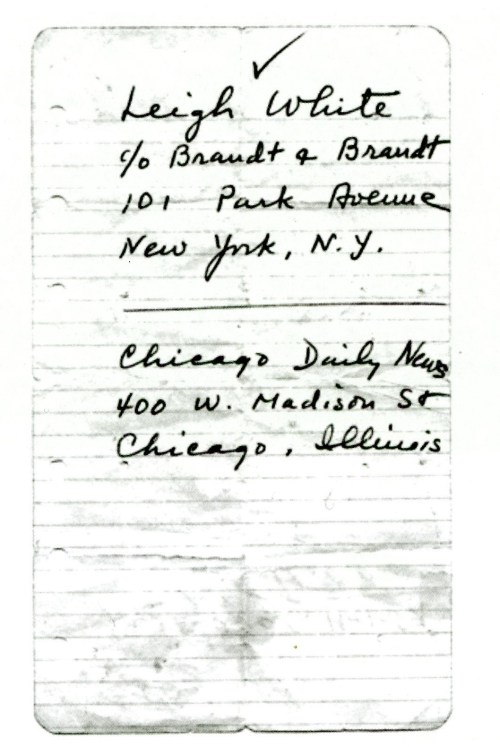 Ιδιόχειρη σημείωση του δημοσιογράφου Leigh White με τις διευθύνσεις του (έτος 1946), που έδωσε στον χειρουργό του Κωνσταντίνο Κεραμίδα.