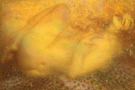 Λουόμενη σε χρυσό φως, όπως και στον Ρέμπραντ, η Δανάη του Dhurmer (Εικ.19), απεικονίζεται τη στιγμή της σεξουαλικής κορύφωσης. Το κορμί της συσπάται, κουλουριάζεται, απολαμβάνει την πλούσια ερωτική εμπειρία. Νομίσματα πέφτουν από πάνω της υπονοώντας την συνεύρεσή της με τον Δία, τονίζοντας την αισθησιακή απεικόνισή της από τον ζωγράφο.