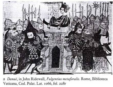 Εικ.2. Η Δανάη περιτριγυρισμένη και φυλασσόμενη από στρατιώτες, ενώ ήδη από πάνω της το σύννεφο έχει αρχίσει να ελευθερώνει τις πρώτες του σταγόνες. John Ridewall, «Fulgentius Metaforalis», Βιβλιοθήκη του Βατικανού.