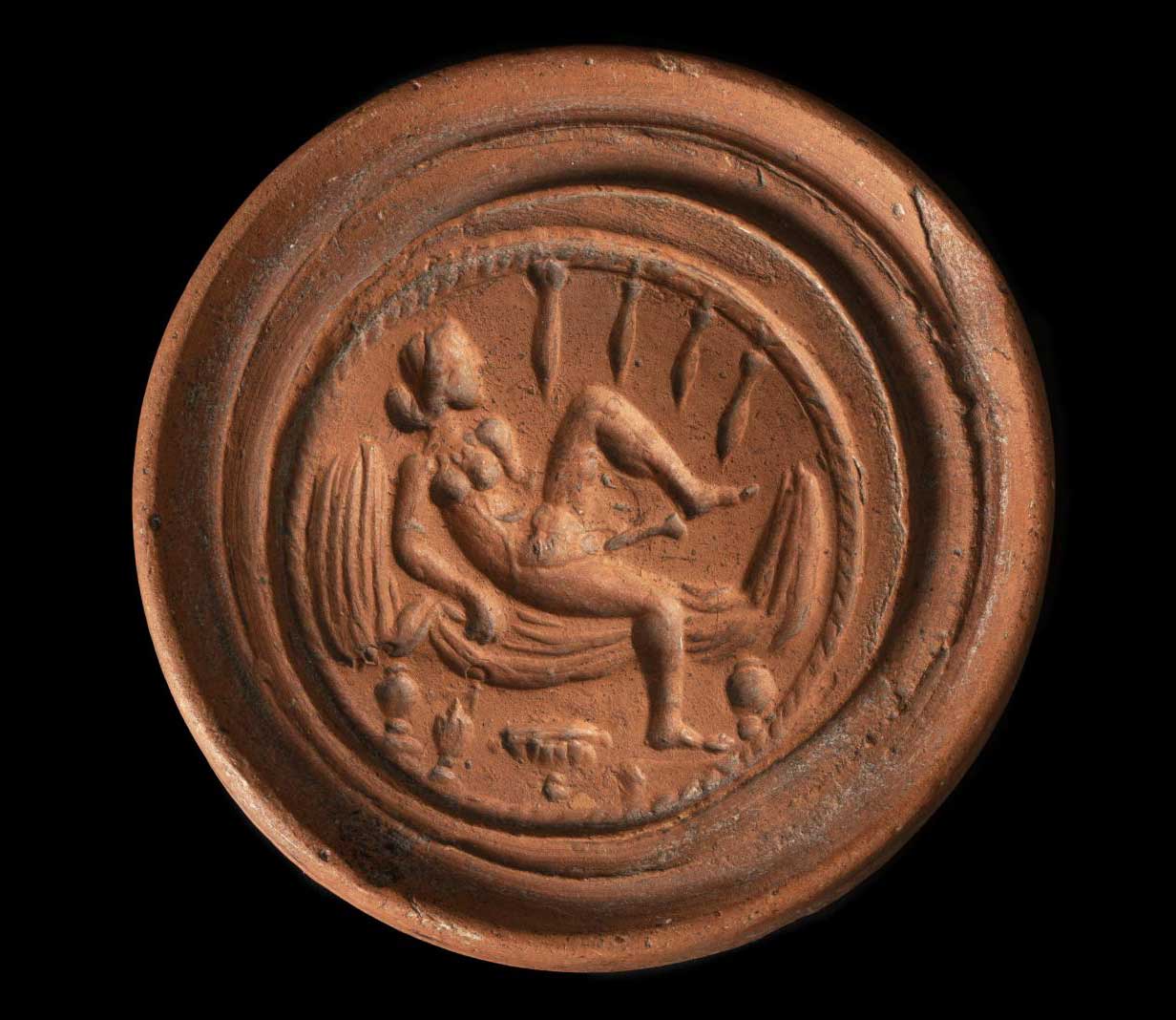 Εικ.1. Η Δανάη ως διακοσμητικό σχέδιο εσωτερικού φόρμας κέικ, 3ος αιώνας μ.Χ. Το Μουσείο Aquincum της Βουδαπέστης φιλοξενεί ένα μικρό καλούπι από τερακότα, το οποίο παρουσιάζει ένα επεισόδιο από τη ζωή της Αργείας πριγκίπισσας Δανάης από την ελληνική μυθολογία: τη σύλληψη του γιου της, του Περσέα. Η πληρέστερη περιγραφή της ιστορίας που απεικονίζεται στον δίσκο μπορεί να διαβαστεί στη Βιβλιοθήκη του Ψευδο-Απολλόδωρου: Ἀκρισίῳ δὲ περὶ παίδων γενέσεως ἀρρένων χρηστηριαζομένῳ ὁ θεὸς ἔφη γενέσθαι παῖδα ἐκ τῆς θυγατρός, ὃς αὐτὸν ἀποκτενεῖ. δείσας δὲ ὁ Ἀκρίσιος τοῦτο, ὑπὸ γῆν θάλαμον κατασκευάσας χάλκεον τὴν Δανάην ἐφρούρει. ταύτην μέν, ὡς ἔνιοι λέγουσιν, ἔφθειρε Προῖτος, ὅθεν αὐτοῖς καὶ ἡ στάσις ἐκινήθη: ὡς δὲ ἔνιοί φασι, Ζεὺς μεταμορφωθεὶς εἰς χρυσὸν καὶ διὰ τῆς ὀροφῆς εἰς τοὺς Δανάης εἰσρυεὶς κόλπους συνῆλθεν. Καλούπι από τερακότα από το Μουσείο Aquincum που απεικονίζει την ιστορία της Δανάης. (Φωτογραφία Nóra Szilágyi).