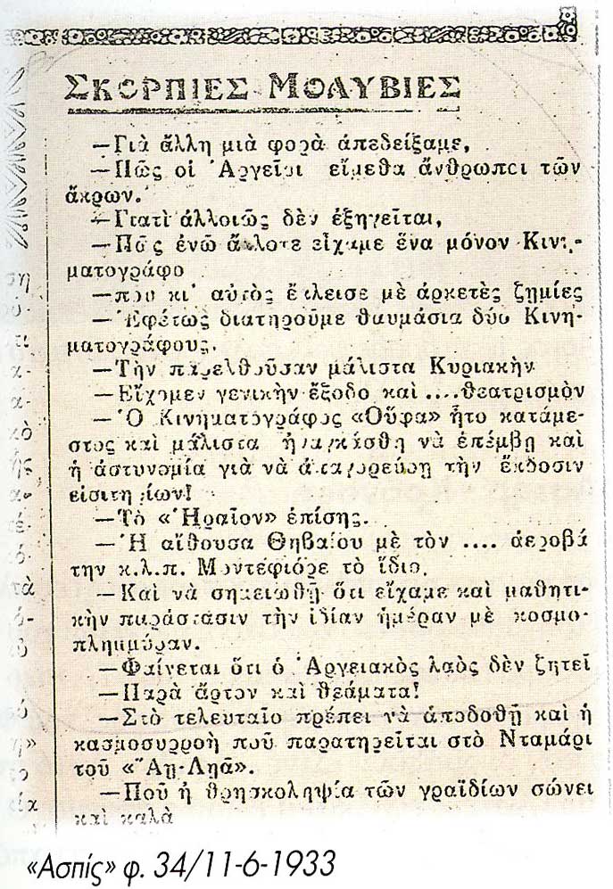 Η ιστορία του κινηματογράφου στο Άργος » «Ασπίς»-φ.-34/11-6-1933.