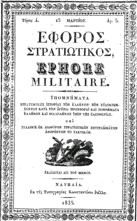 [1] Παναγιώτης Ρόδιος,Έφορος Στρατιωτικός, εκδ. Κ. Ράλλη, Ναύπλιο 1835.