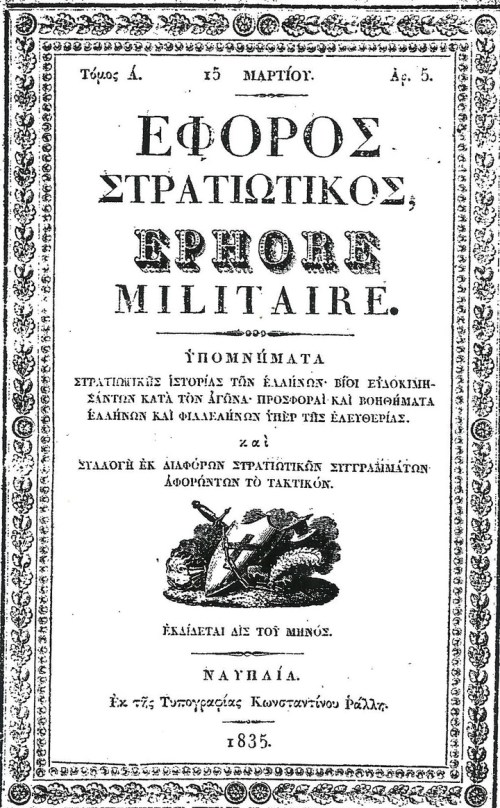 Στρατιωτική βιβλιογραφία και ιστοριογραφία στην Αργολίδα μετά την Επανάσταση: Η περίπτωση της έκδοσης Έφορος Στρατιωτικός (1835) και του συγγραφέα της Παναγιώτη Ρόδιου » Έφορος Στρατιωτικός